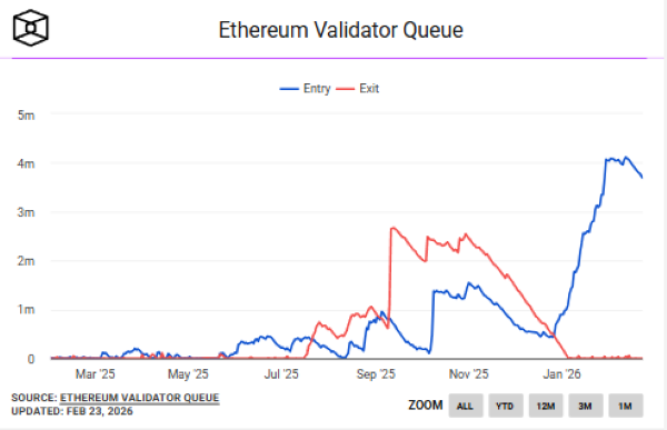 Sul fronte di Ethereum, il dato più significativo di questa settimana non è il prezzo, ma la coda validator: oltre 4 milioni di ETH in attesa di attivazione con tempi superiori ai 60 giorni, la domanda di staking più alta dal 2023. Simultaneamente, la coda di uscita è vicina a zero, mentre a settembre 2025 era a 2,67 milioni di ETH. Il 30% della supply circolante di ETH è ora in staking, un livello strutturale che riduce l’offerta disponibile per il mercato. Parte di questa domanda viene dall’accumulo istituzionale: BitMine detiene circa 4,37 milioni di ETH, pari al 3,6% della supply circolante, con l’obiettivo dichiarato di salire al 5%. SharpLink, la seconda più grande corporate treasury ETH, detiene circa 867.000 ETH con quasi nessuna uscita prevista. E BlackRock ha avviato il seeding del suo iShares Staked Ethereum Trust (ETHB), con una quota target del 70-95% degli asset in staking per un rendimento annuo stimato del 3%, il cui lancio è atteso nel primo semestre 2026.