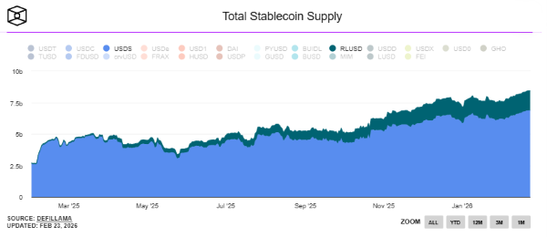 In questo contesto di compressione generalizzata, il mercato delle stablecoin racconta una storia completamente diversa, e merita attenzione separata. USDS di Sky Protocol ha raggiunto un nuovo record di circa 6,9 miliardi di unità, crescendo del 48% anno su anno, con oltre 290 milioni di dollari di supply aggiuntivi solo nell’ultimo mese. La traiettoria non è casuale: Sky ha lavorato sistematicamente su espansione istituzionale, tra cui il lancio di Keel come allocatore di capitale on-chain con una campagna da 500 milioni per attrarre emittenti di Real World Asset su Solana e l’ingresso come curatore di Morpho Vault. Parallelamente, RLUSD di Ripple ha superato 1,5 miliardi di offerta il 20 febbraio, partendo da appena 83 milioni un anno fa, e ora si avvicina alla soglia dei 2 miliardi. La differenza rispetto ad altre stablecoin è strutturale: RLUSD opera sotto statuto DFS di New York con supervisione a livello bancario, Ripple ha approvazione condizionata per statuto OCC, e la recente quotazione su Binance ha creato l’infrastruttura di liquidità necessaria per scalare con desk istituzionali. Il messaggio è chiaro: in un mercato che comprime i valori speculativi, le stablecoin con rendimento o differenziazione normativa attraggono flussi che altrimenti si fermerebbero.