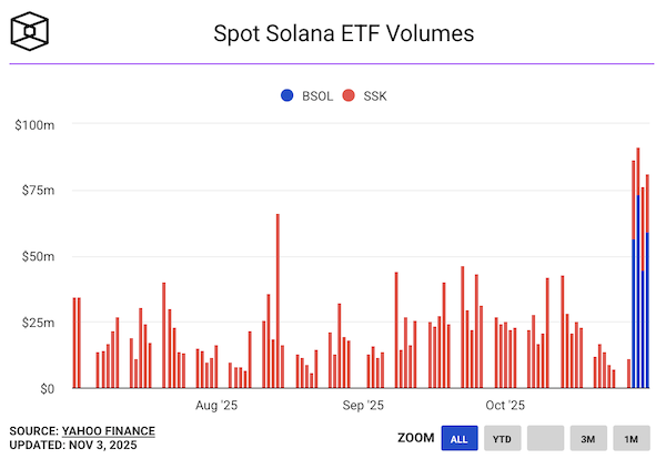 Solana’s exchange-traded products market welcomed a new heavyweight on 28 October with the launch of Bitwise’s BSOL, a staking-enabled ETF that has rapidly dominated the sector. BSOL recorded the highest launch volume of any ETF in 2025, marking the second consecutive year that a crypto ETF has achieved this accolade, following last year’s Bitcoin ETF launches led by BlackRock’s IBIT. After the first week of trading, BSOL has assets under management of about $400 million, quickly surpassing Rex-Osprey’s SSK at $370 million. The ETF’s structure provides direct exposure to Solana, with an average annual return of 7 per cent for holders and a management fee of 0.20 per cent, with a promotional fee of 0 per cent on the first billion assets invested for three months.