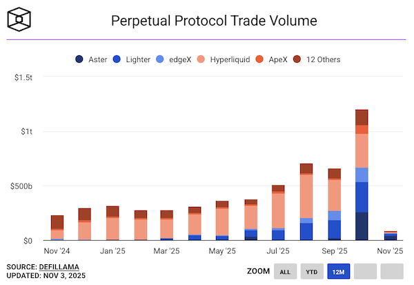 Total trading volume on DEX perpetual futures reached an all-time high of $1.2 trillion in October, almost double the previous month’s total. This boost was mainly driven by Lighter, Aster, EdgeX, Pacifica and ApeX, which all recorded record monthly volumes. Hyperliquid was the exception among the major DEX, closing the month at about 16% below its peak two months earlier, allowing Lighter to become the leading DEX perp in the market with a 27% share, while Hyperliquid’s market share dropped to 10% from 33% just a month ago.