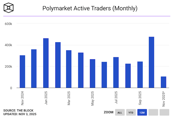 Polymarket recorded more than 477,000 active traders in October, the highest number ever recorded by the platform in a single month, up 48 per cent month-on-month from the previous period. This number even surpassed the previous US election peak of around 462,000 traders in January 2025. Both the volume traded and the number of new markets reached new record monthly highs, with the former more than doubling the previous month’s total to over $3 billion. Open interest is also up after a post-election decline, and looks set to approach previous highs.