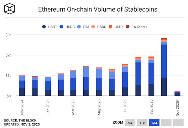 On-chain stablecoin volume on Ethereum, which measures the USD value of all stablecoin transfers, was $2.82 trillion in October, representing a 31% month-on-month increase and the highest ever recorded. Growth was mainly driven by USDT and USDC, with the former surpassing USD895bn and the latter reaching USD1.62 trillion, both higher than in previous months. Other notable stablecoins such as USDe, USDS and PYUSD failed to surpass the previous month’s totals.