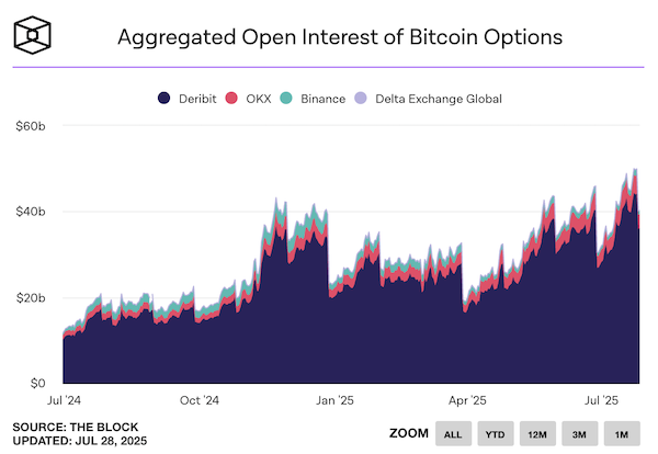 Then there is the world of derivatives, where interest in Bitcoin options has reached almost $50 billion, with Deribit controlling around $45 billion. Add to that the 7 billion in the ETF universe, such as IBIT options. Coinbase, which acquired Deribit for $2.9 billion in May, now enjoys a dominant position in a market that attracts both retail and institutional traders. In parallel, Ethereum continues to benefit from this speculative and institutional wave, consolidating its central role in derivatives markets and treasury strategies.