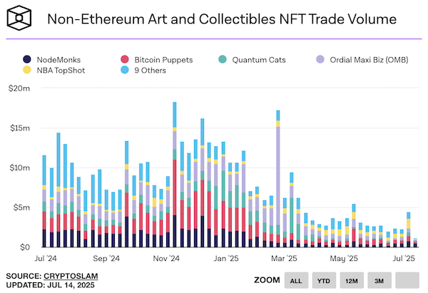Mentre Bitcoin rompe nuovi massimi storici, il mercato delle criptovalute si sta caricando di entusiasmo speculativo, con un ritorno deciso verso gli asset ad alta volatilità. Tra questi, gli NFT stanno vivendo un’improvvisa e inaspettata rinascita, soprattutto all’interno di ecosistemi alternativi a Ethereum. Nelle ultime settimane, il volume di scambi di NFT su blockchain non-Ethereum ha superato i 4 milioni di dollari, un balzo significativo dopo mesi di letargo, che segna un raddoppio rispetto alla settimana precedente.